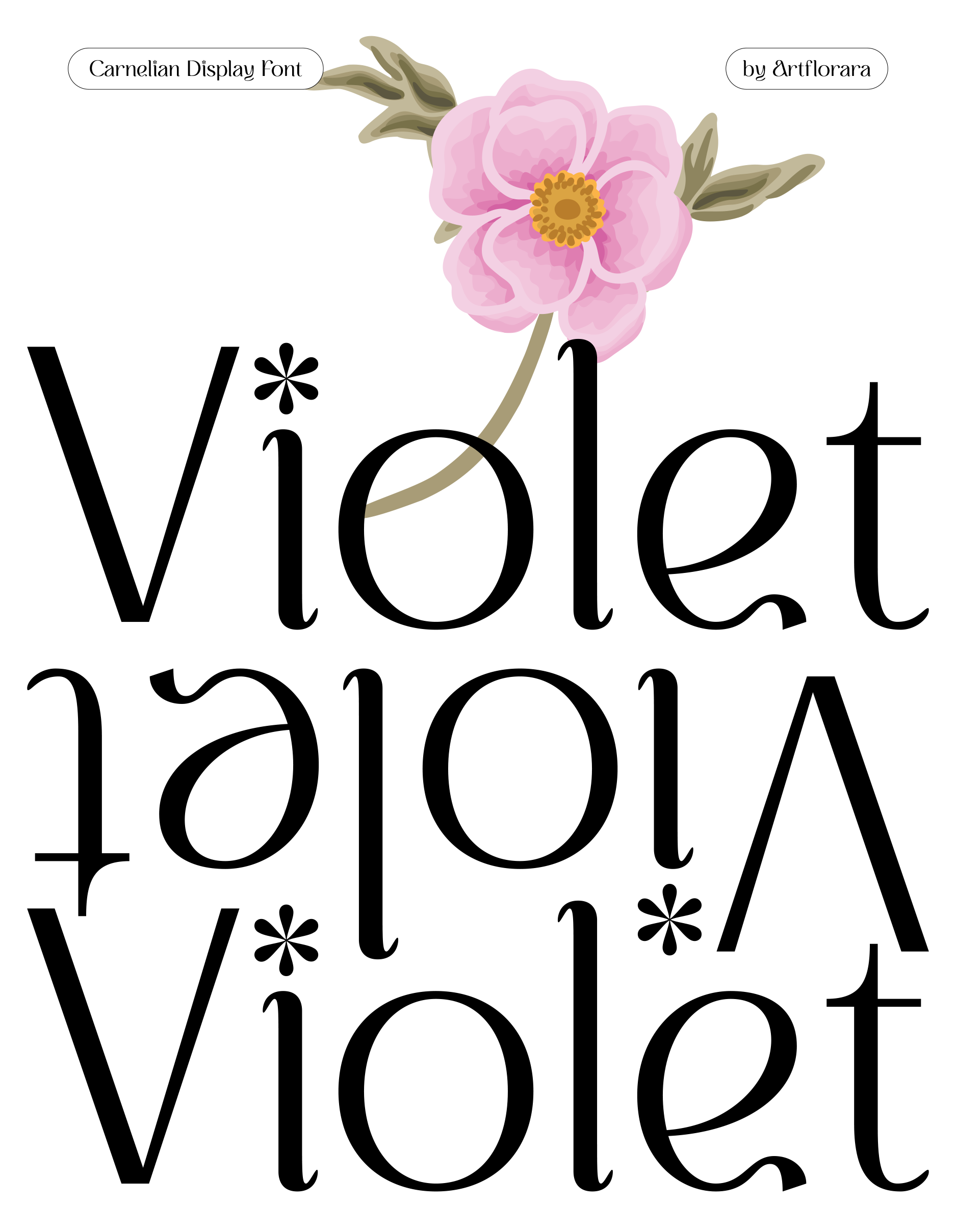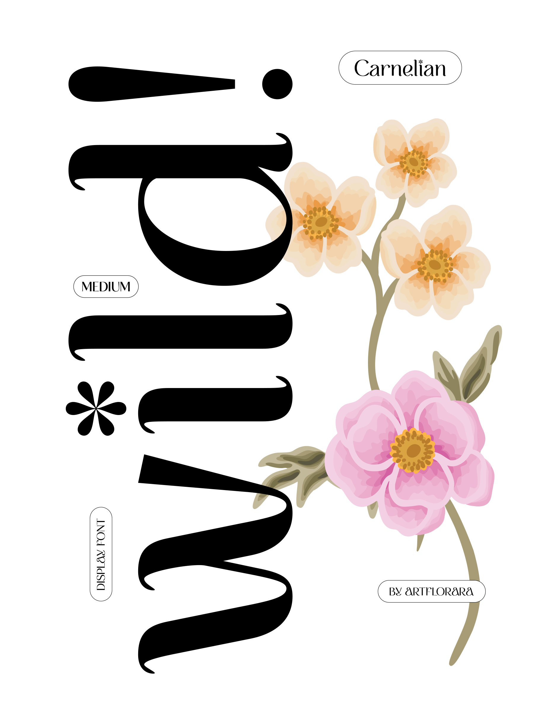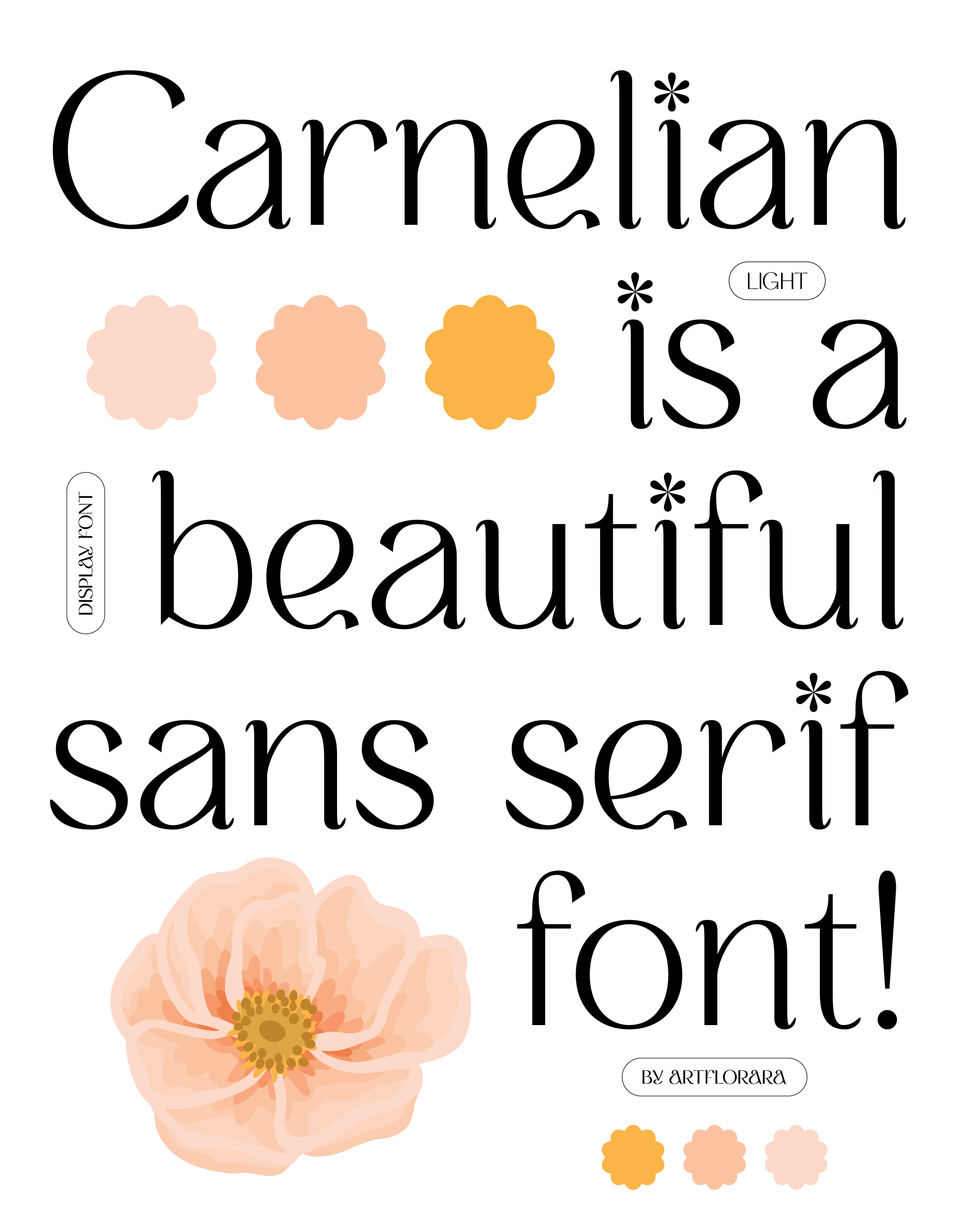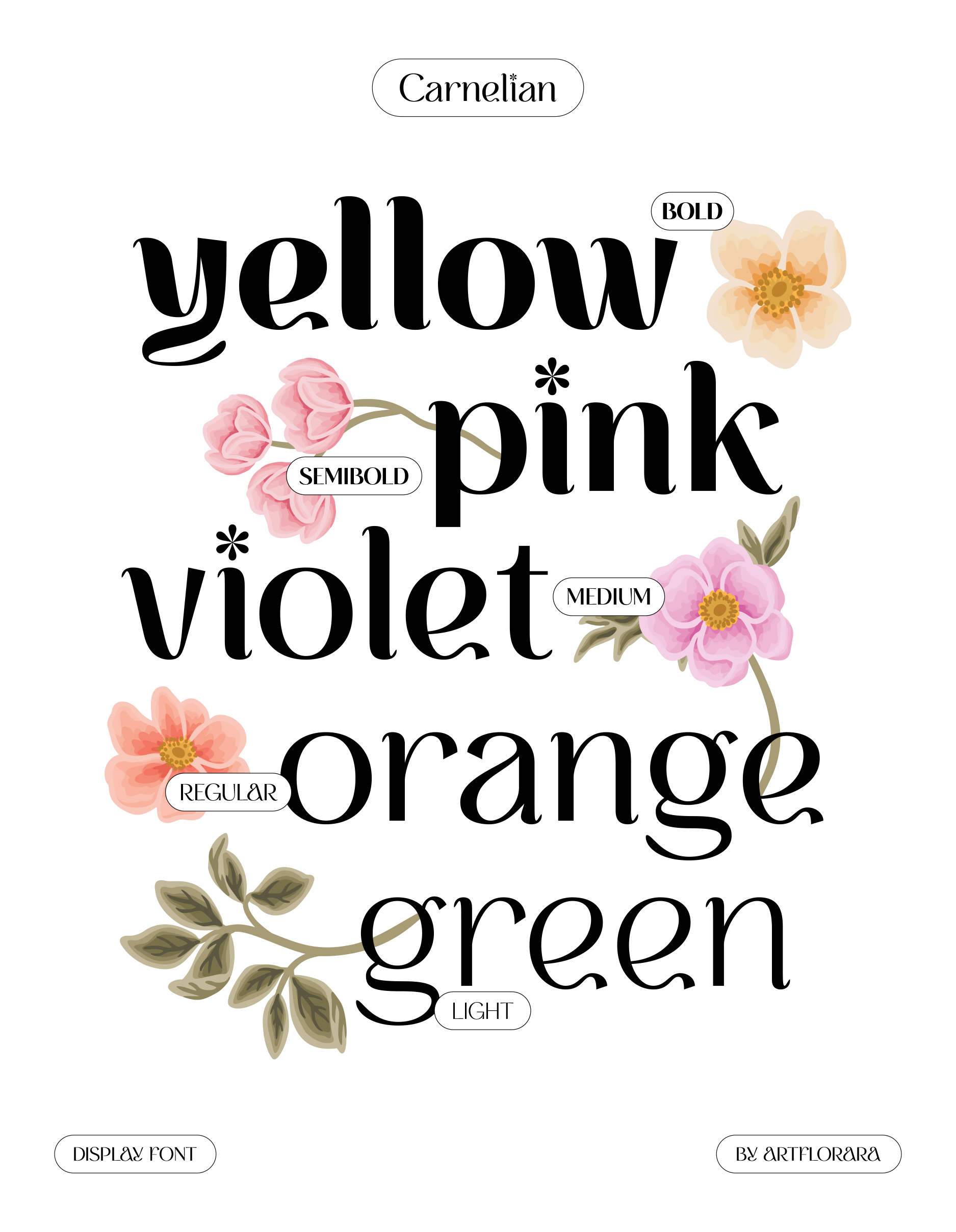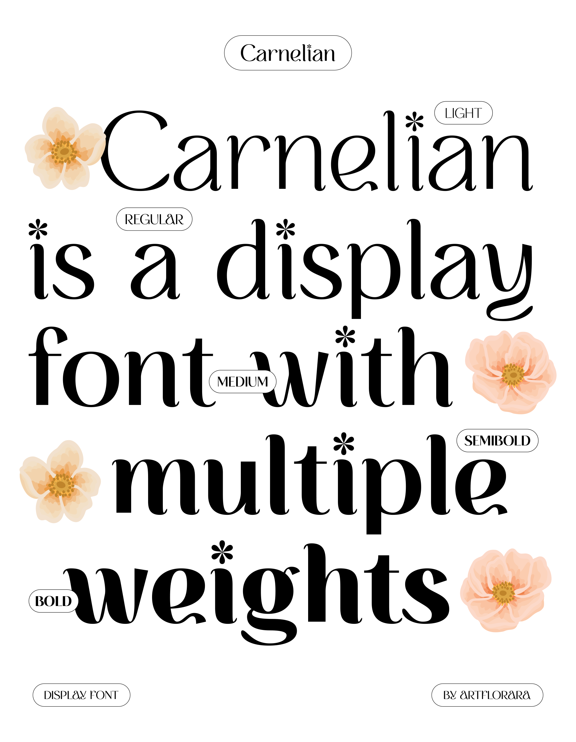 Carnelian features flower-shaped tittles on the lowercase i and j, adding a subtle organic charm, while the uniquely designed tail on the y and the distinctive finial on the lowercase e give it an artistic, elegant twist. Ideal for wedding invitations, greeting cards, branding, editorial layouts, and any project that calls for refined individuality.