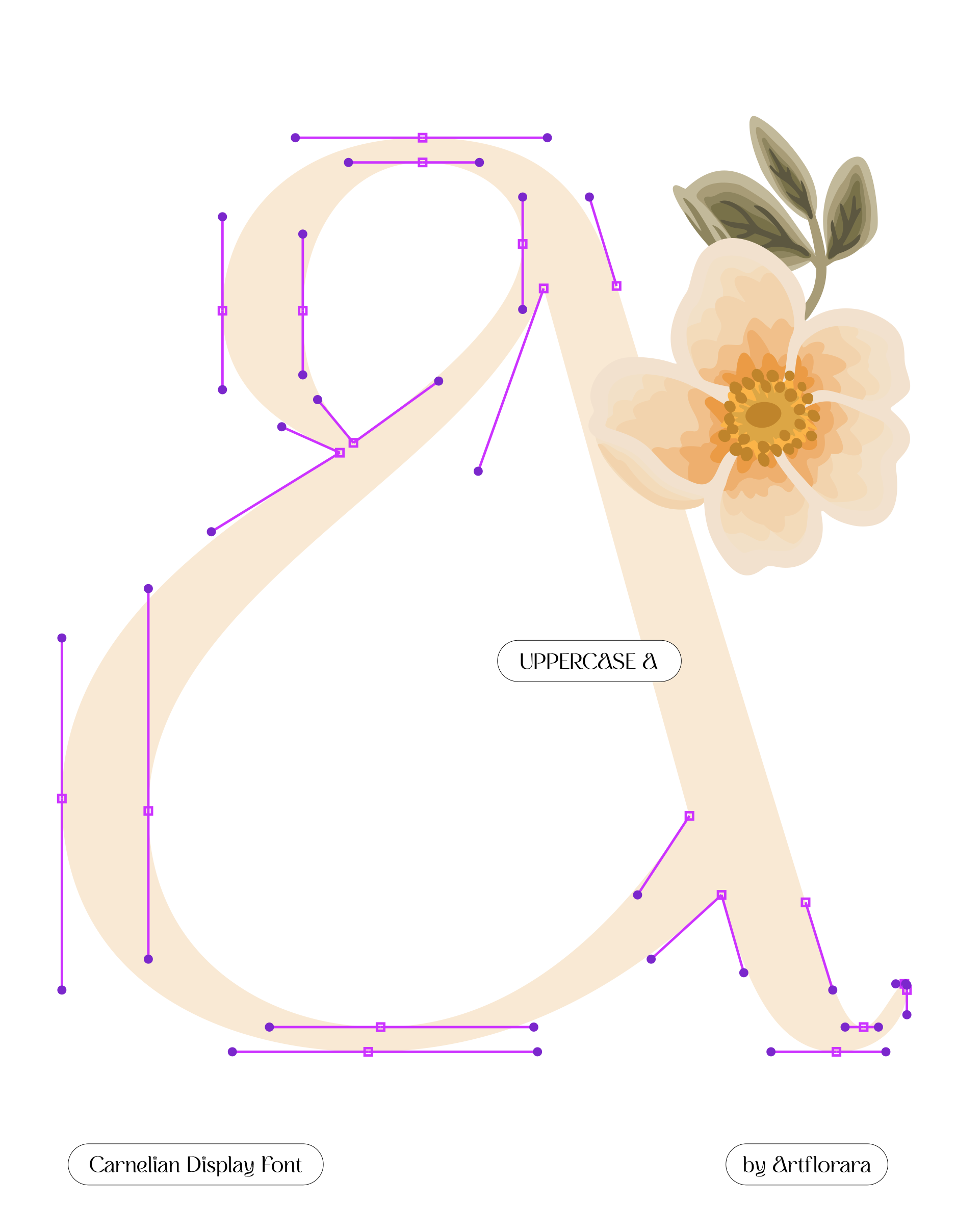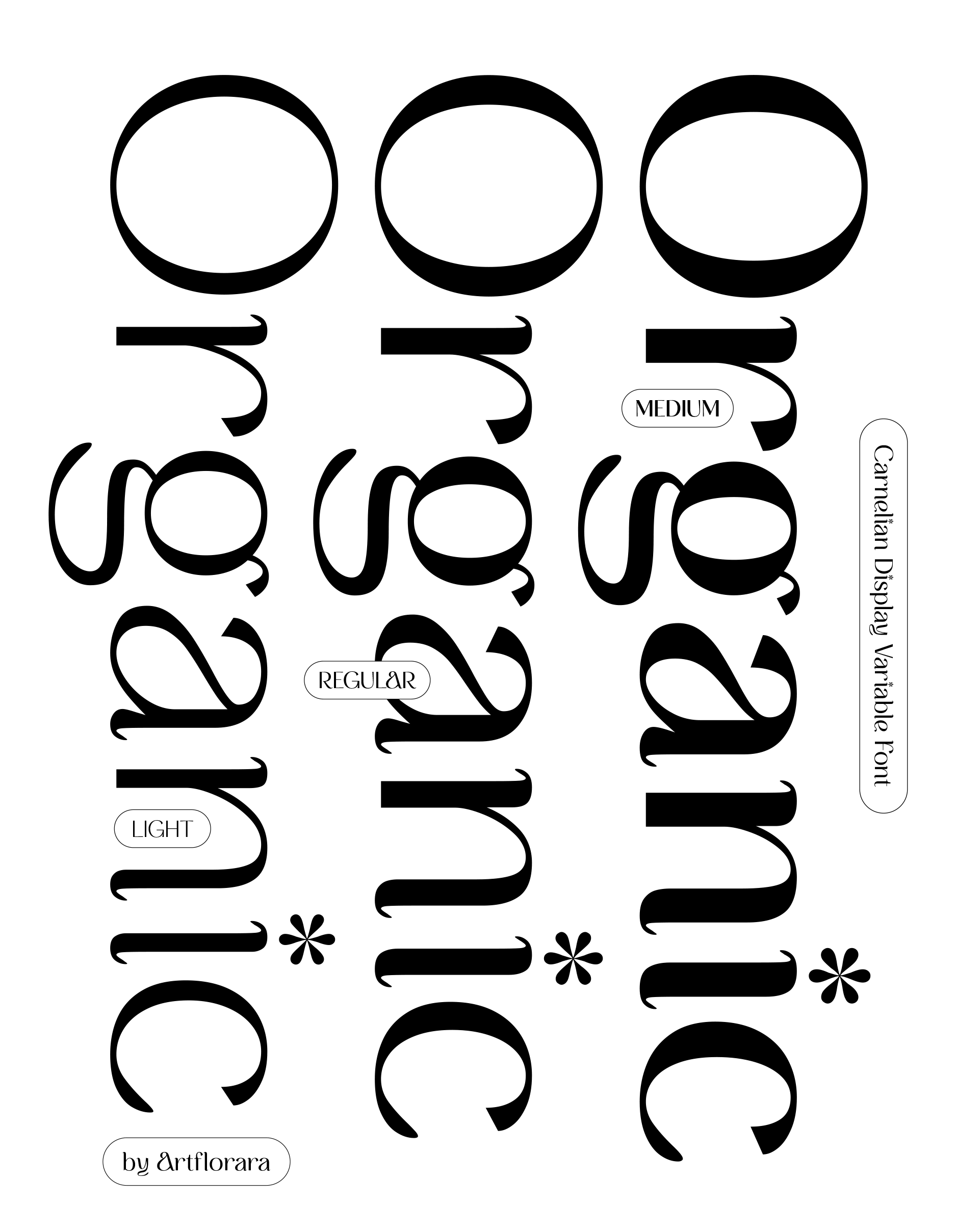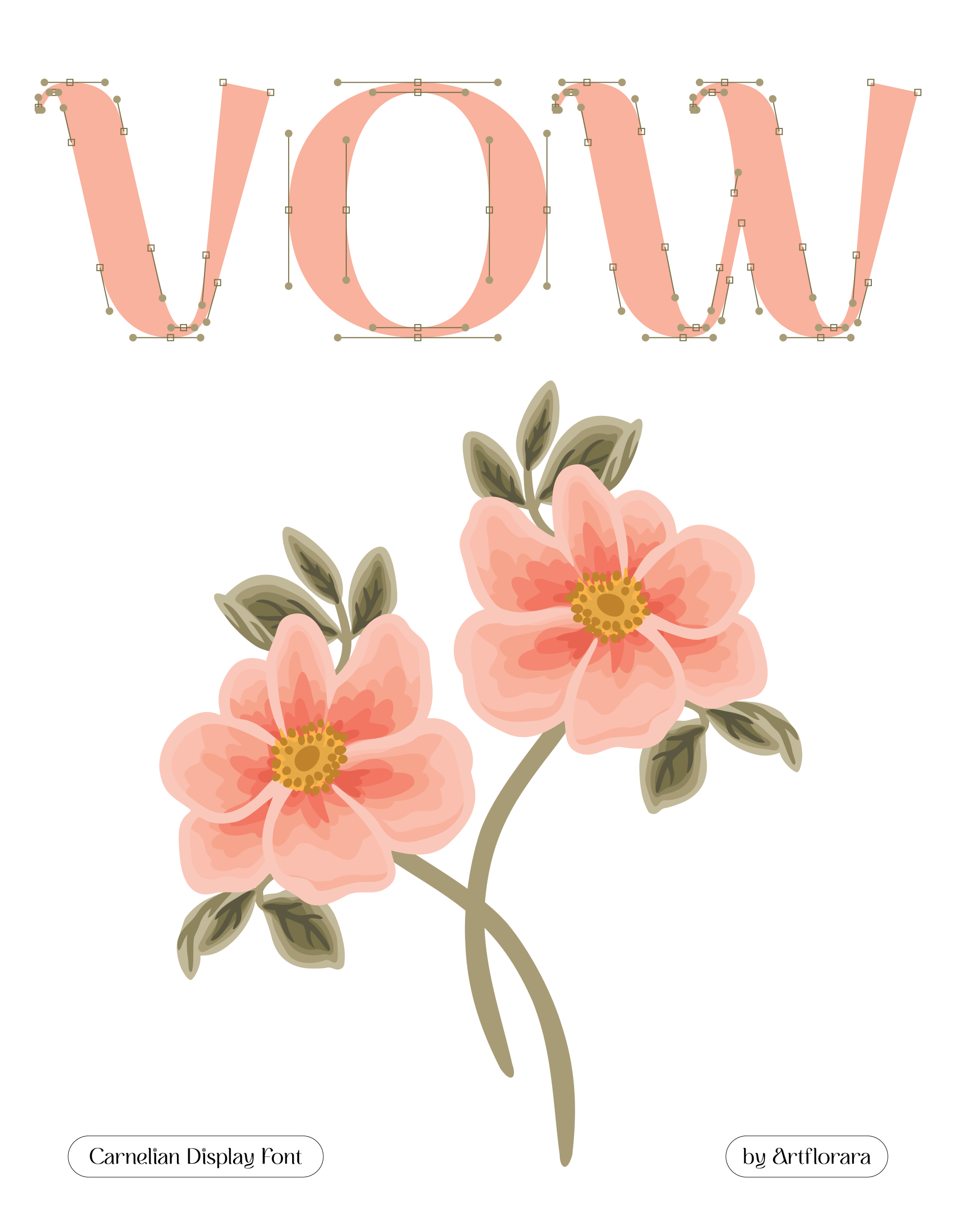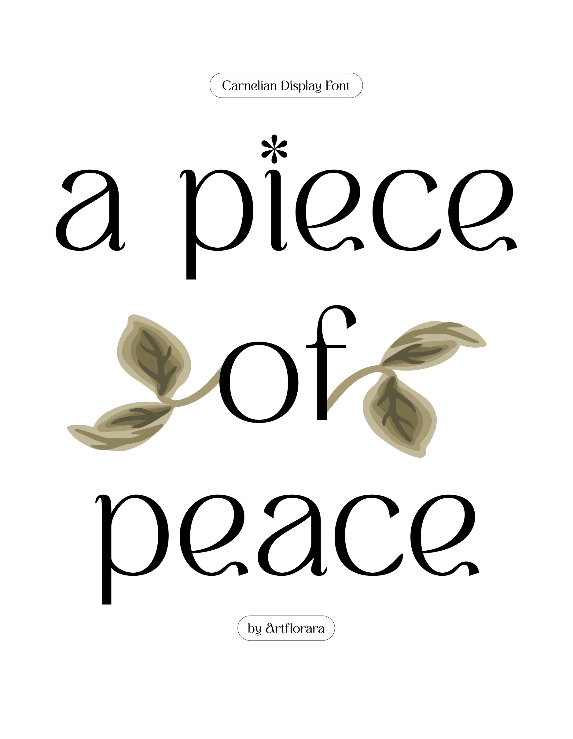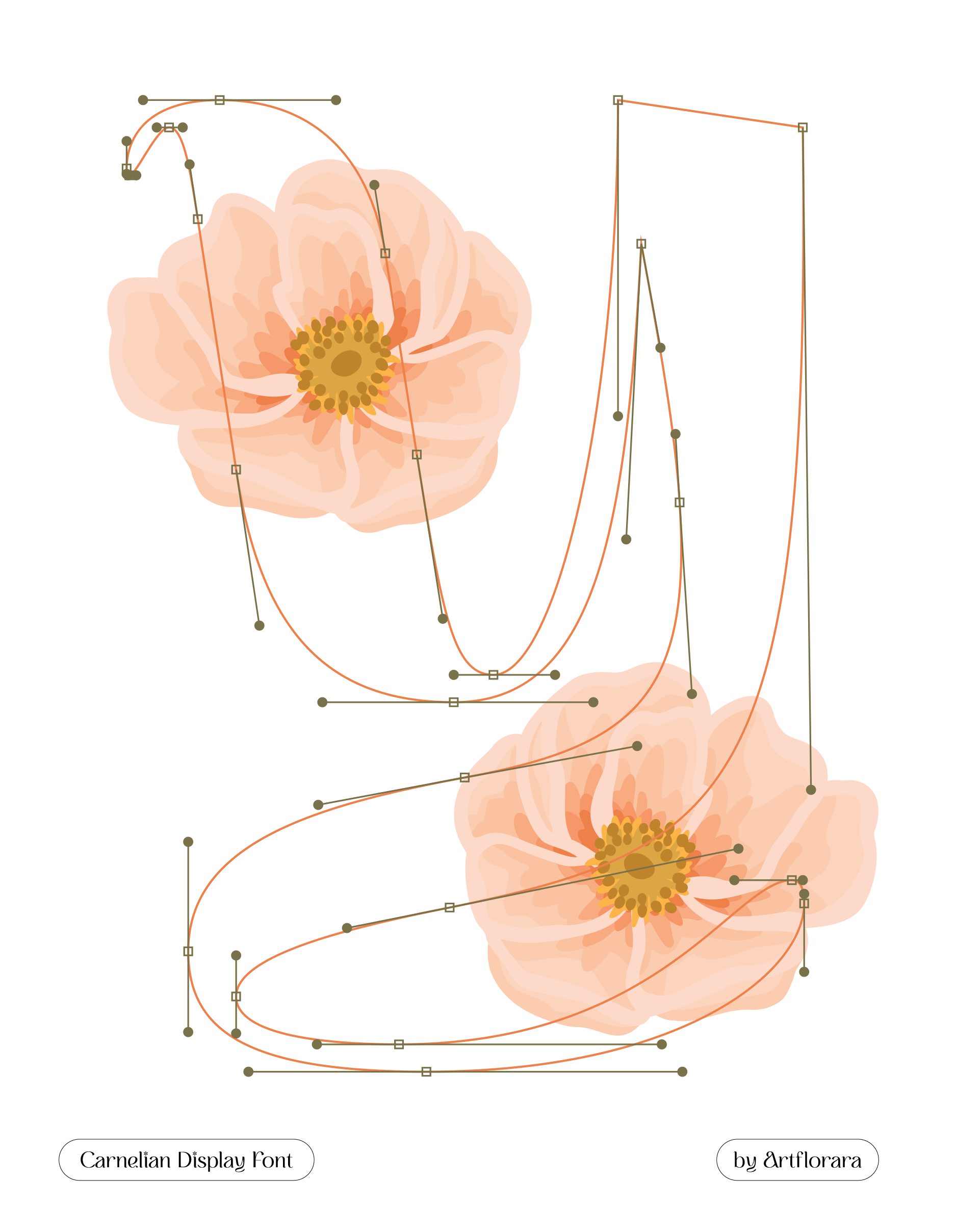 Carnelian features flower-shaped tittles on the lowercase i and j, adding a subtle organic charm, while the uniquely designed tail on the y and the distinctive finial on the lowercase e give it an artistic, elegant twist. Ideal for wedding invitations, greeting cards, branding, editorial layouts, and any project that calls for refined individuality.