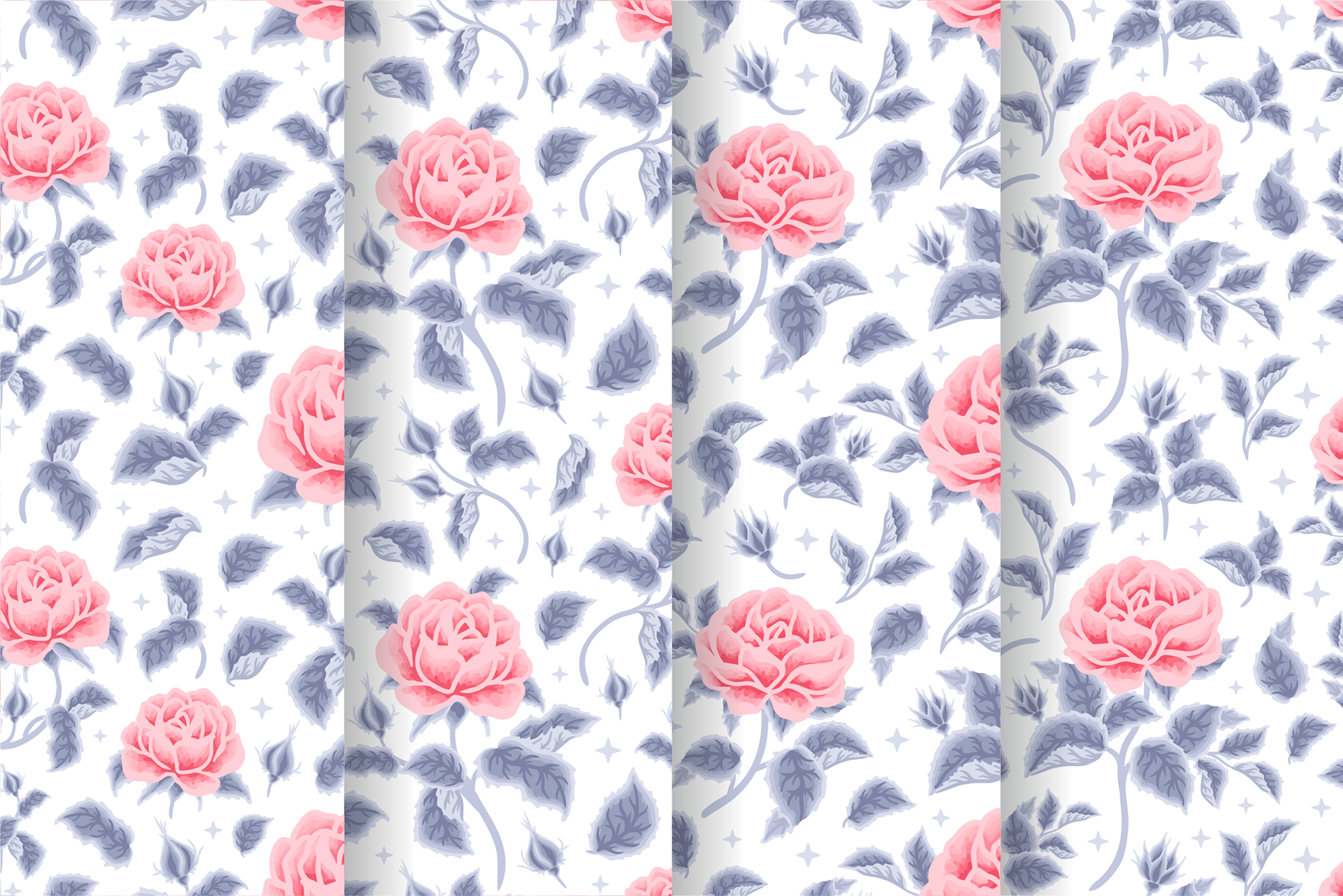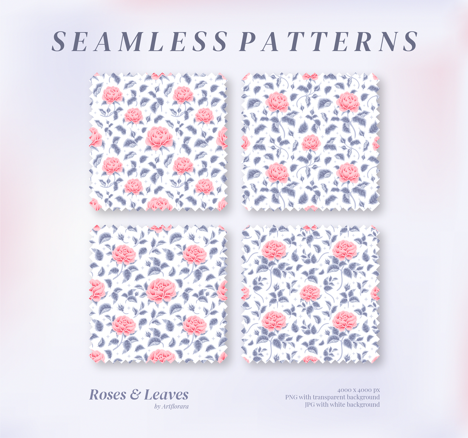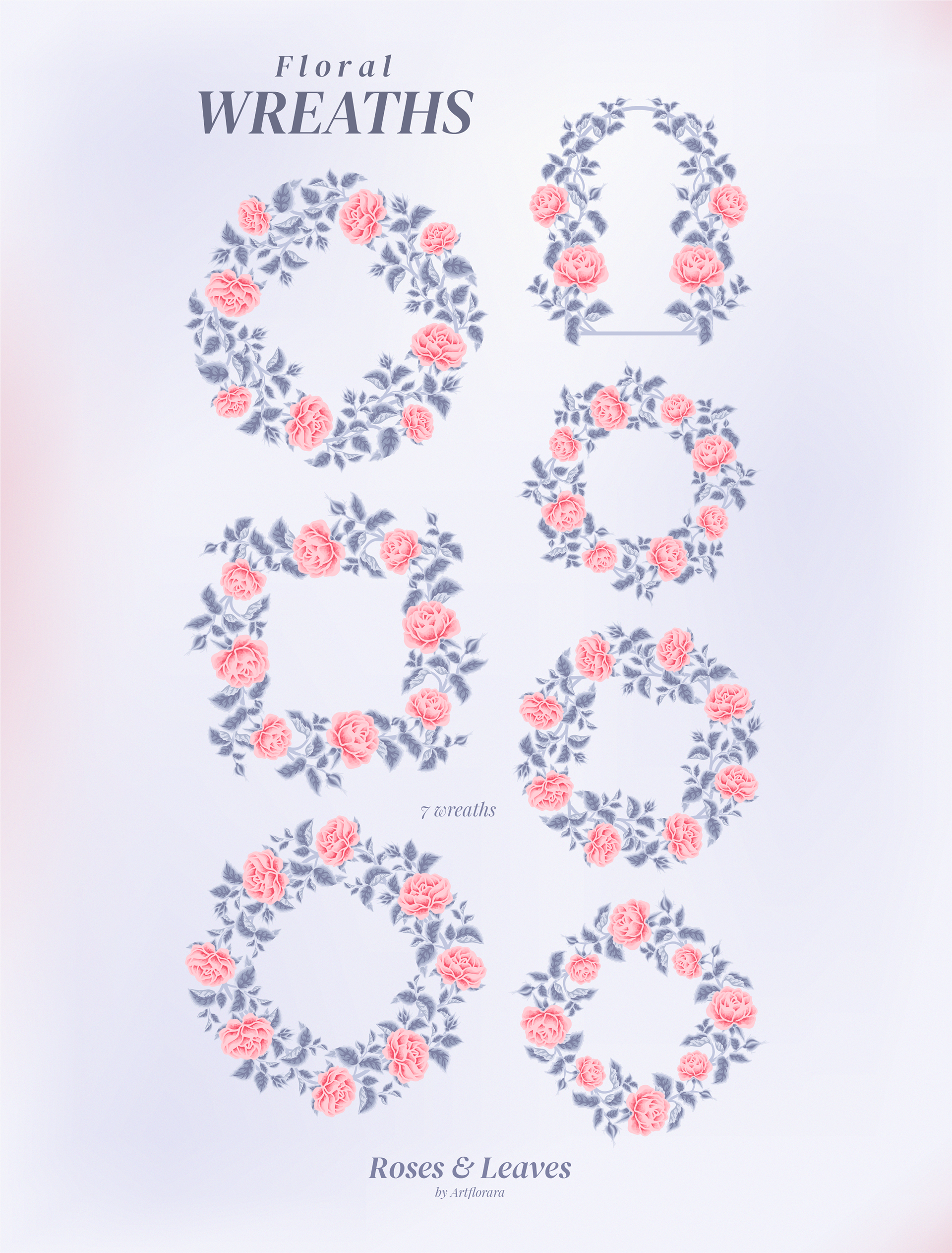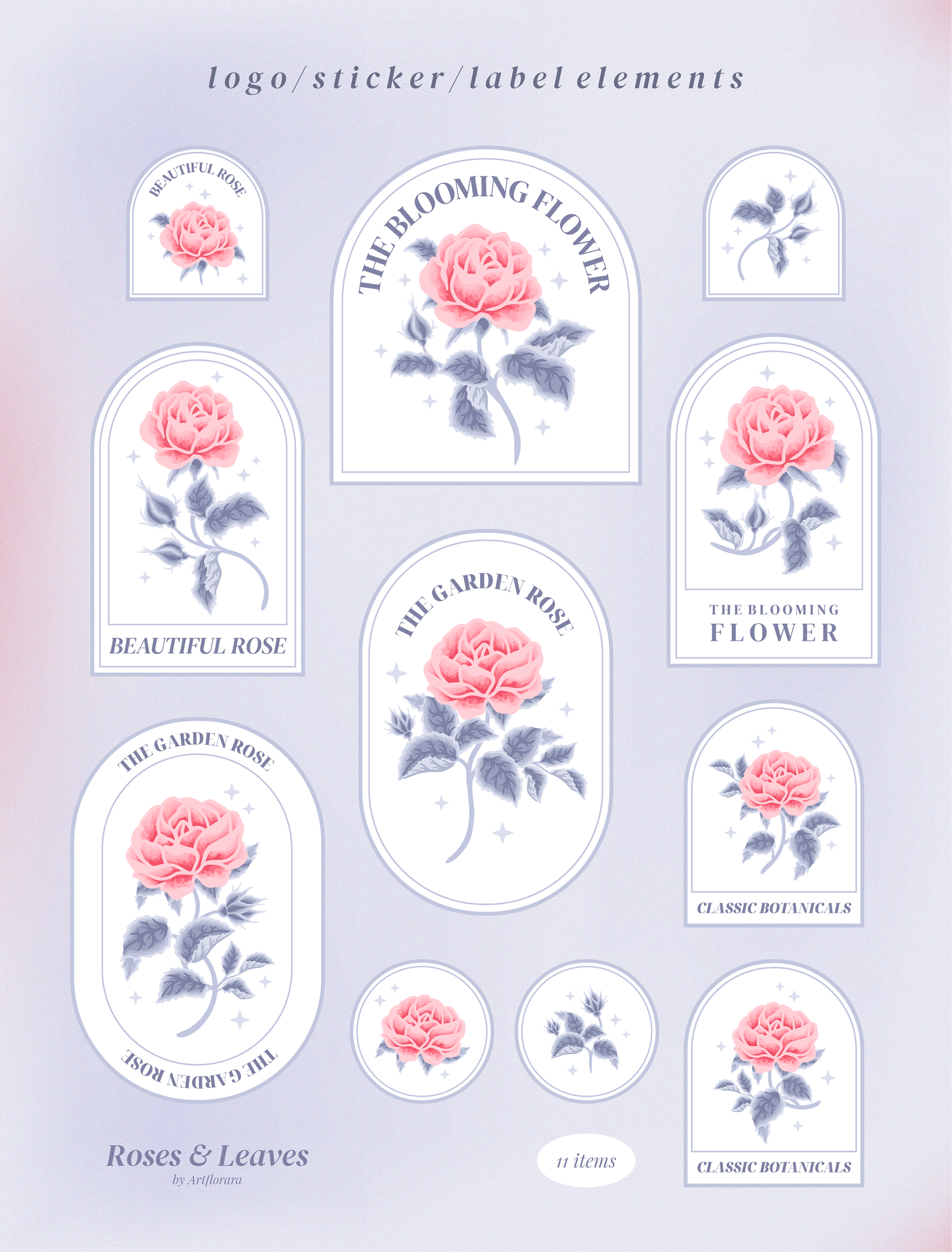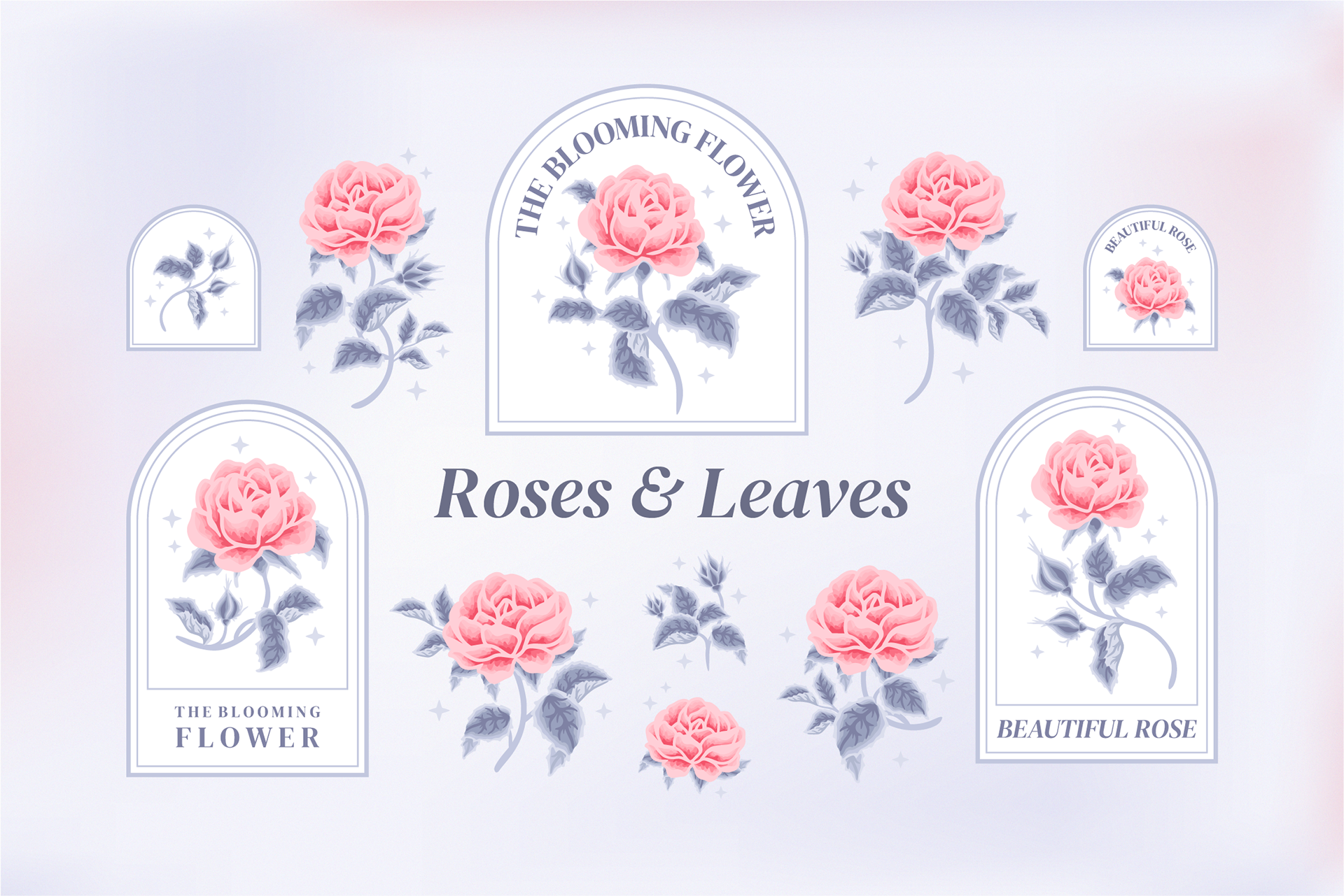 This floral set consists of individual elements, floral logo/label/sticker elements, wreaths, and seamless patterns.