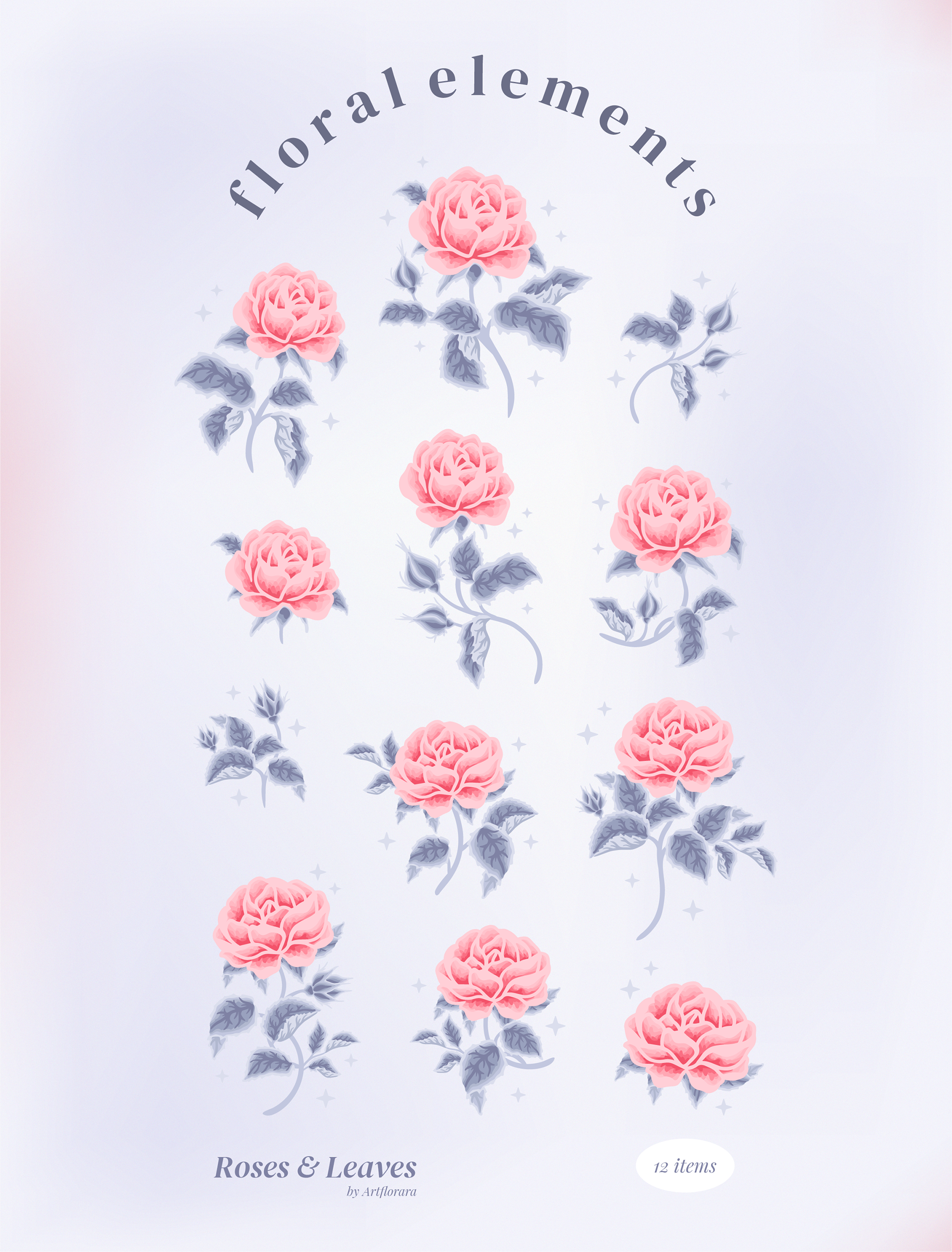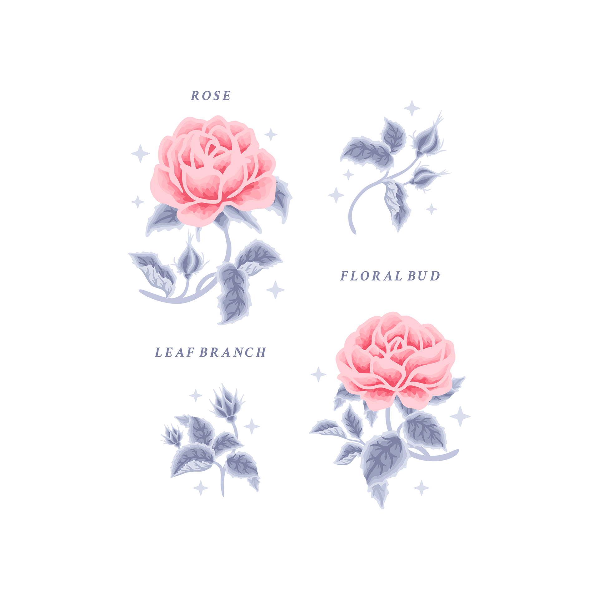 Digitally hand-drawn floral elements, delicately arranged with soft color vibes.